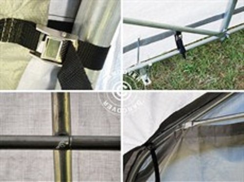 Tälthallens ställning är konstruerad av galvaniserat stålrör med en god rostskyddande ytbehandling. Bottenramen fastgöres i underlaget med de medföljande jordspikarna för att säkra tältet mot starka vindar. Dessutom är tältduken försedd med en jordkjol på långsidorna, vilka vi rekommenderar mot starka vindar. Dessutom är tältduken försedd med en jordkjol på långsidorna, vilka vi rekommenderar att du gräver ner i jorden eller liknande för att säkra tältet mot att vinden kommer in denna väg. Tältet kan också monteras på träläkte eller betongfundament med expansionsbultar om förhållandena kräver detta.