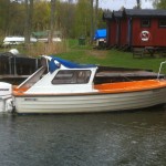 Min båt har en i efterhand påmonterad akterhytt, modell Crescent. Akterspegeln är orörd och det hänger en 75 hk Evinrude e-tec där. Mycket motor men bra att ha när man är tungt lastad. Jag funderar på att flytta motorn bakåt ca 70 cm på en bracket (som många Örnvik Trader) för att få bättre köregenskaper och kunna använda motorbrunnen som akterdäck - men det får bli en annan tråd.