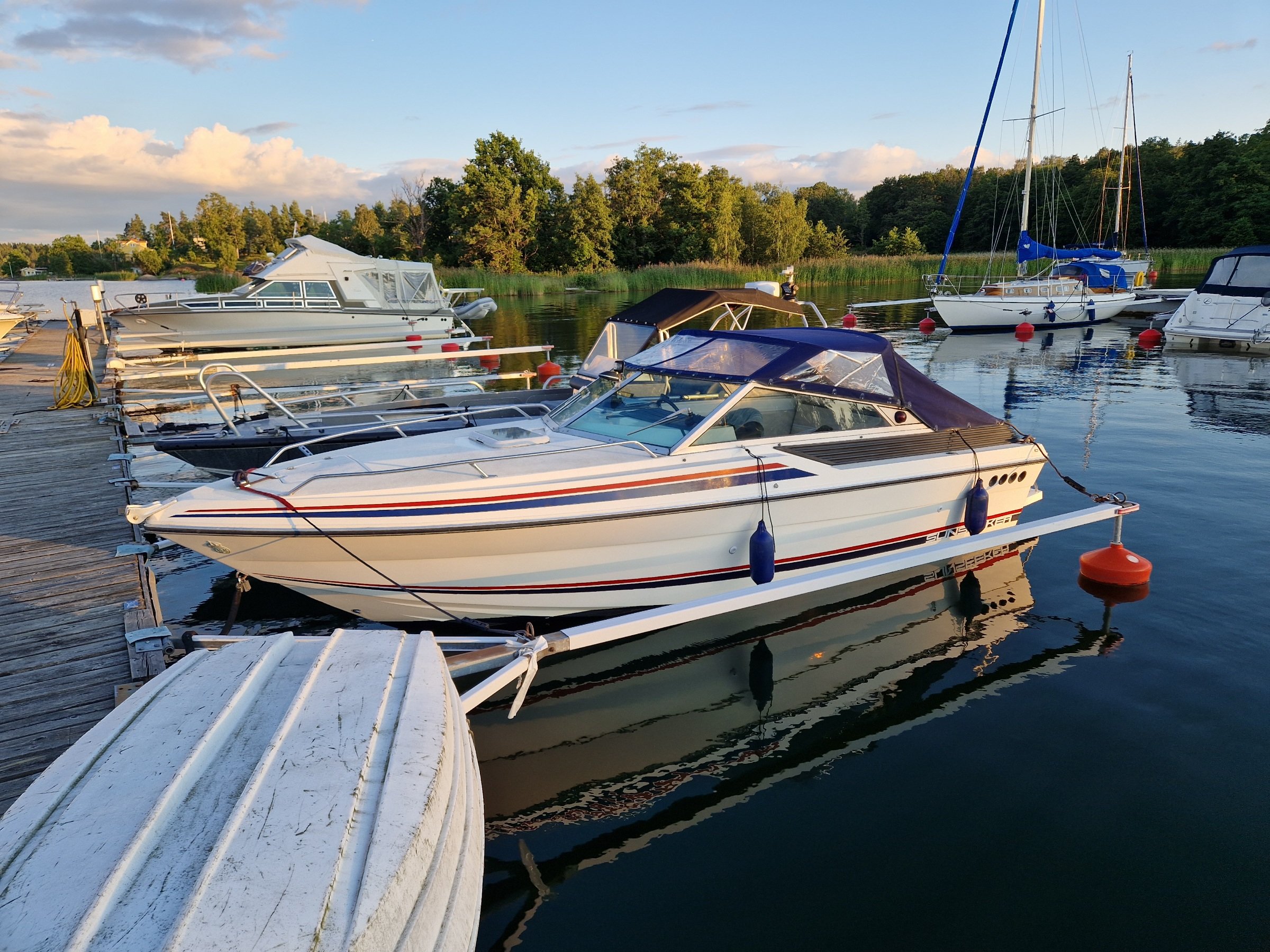 Kul projekt! Har en Sunseeker Portofino XPS21 från 1987 där tidigare ägare bytt till en GM V8 5,7 med förgasare på 260 hk kopplad till VP 280-drev. Toppar 33-34 knop och drar i marschfart (22-25 knop) runt 2,3 l/nm.