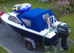 Total renoverade både botten och skrovsidorna så jag valde att vända min upp och ner mha ställning och två stycken spännband. Snorde sedan runt båten i spännbands-vagganoch la den uppochner på bockar samt bildäck. Kunde både slipa och måla både skrovsidor samt botten och komma åt överallt.