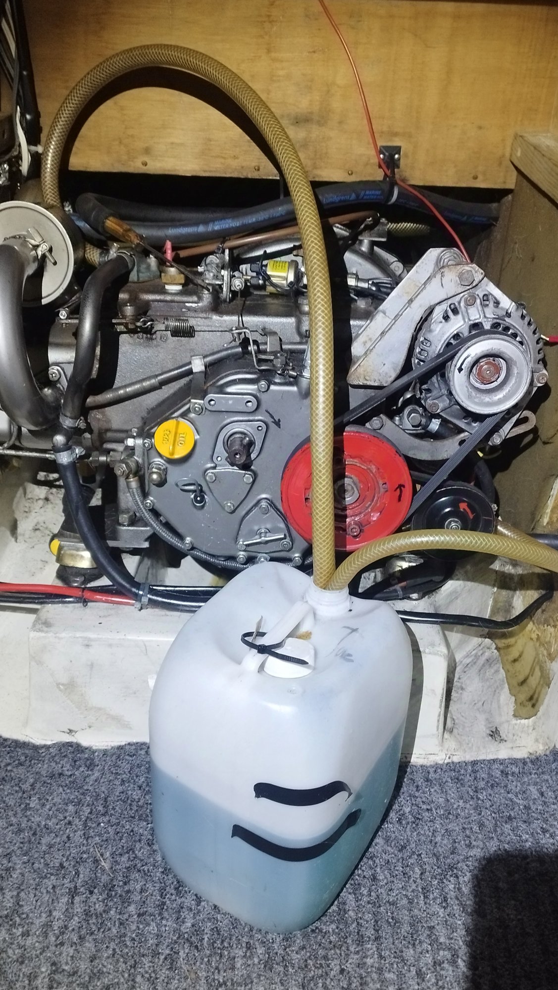 Hybro 1 301 Postad 16 November , 2024 När motorn går, blir det lättare. Först kopplar jag bara den högra slangen från kylvattenpumpen (med impeller) till botten på stora dunken. Startar motorn. Stänger av när blåfärgad glykolvatten kommer ut med avgaserna. Hänger upp en hink under avgasröret. Lossar original kylvattenslan som går mellan termostathuset och inloppet till avgassystemet. Pluggar inloppet. Kopplar vänstra slangen från termostathuset och ned i dunken. Startar motorn som nu kyls och häller det blåfärgade vattnet som kom ur avgasröret i stora dunken. Ungefär gång per månad startar jag båten och kör såpass länge attjag inte kan hålla handen på motorns avgasknä. Ca 5 minuter. Dela detta inlägg Länk till inlägg Dela på andra webbplatser