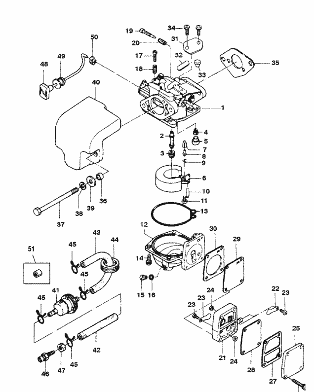Mercury_44XS 398 Postad igår kl 17:07 32 är en gummiplugg och 33 är en gummipackning och båda har till uppgift att täta kanalerna i lågfartssystemet som finns under plattan 31. Är dom defekta, uttorkade eller skadade på annat sätt så går motorn inte speciellt bra på låga varvtal upp till ca 1500–2000 r/min då den börjar gå på huvudmunstycket. Ska kolla om jag har några bra bilder som visar hur det funkar om du vill veta, en bild säger ofta mer än 1000 ord. //Pär Dela detta inlägg Länk till inlägg Dela på andra webbplatser