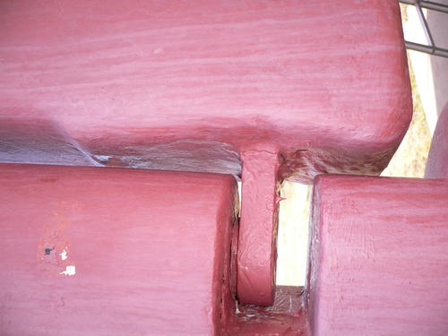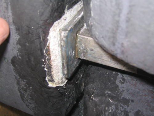 Det kan vara en konstruktion i efterhand för att förstärka. Det är lätt att det blir för stora påkänningar vid ett inplastat stålbeslag så det börjar läcka. Bättre att det är skruvat från utsidan.