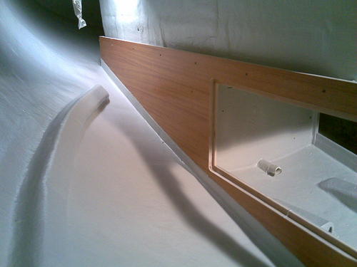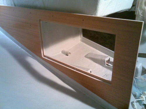 iag så  är planen att sättta nav modulen på plats. så jag  fick börja med sätta upp en list på skottet  där en inre hylla i naven måste få sitt stöd. plus att jag måste fortsätta med täckskott. på nav modulen sitter en bit täck skott men det täcker ju långt ifårn allt, ses  på dom bilderna längre upp.  så jag brukar göra mallar i papp kartong och malla av med passare  sen lägga upp och rita på en 7mm täck skott  marin plywood  knivskuren lackad  4lager med  2komponet lack glas 25 . hela inredningen är lackad på så vis.