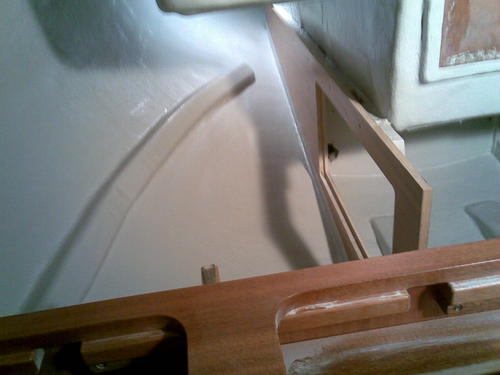 och här ser man listen som hyllan i naven kommer ligga mot. resten av listerna sitter redan i naven.  vilar även täck skotten  på den.