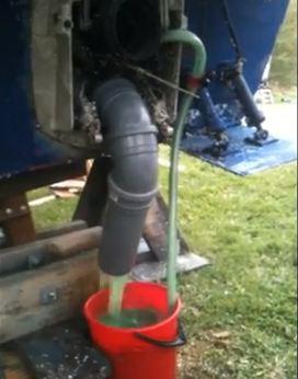 På Alpha drev sitter det två utlopp på sidorna av skölden och där stoppar man två slangbitar så de går ned i baljan.