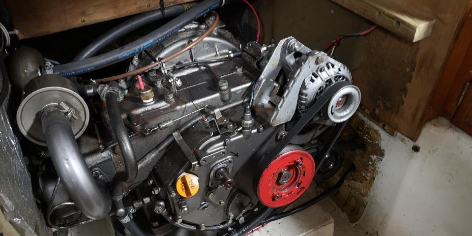 Hybro 1 312 Postad 1 Juli , 2019 (redigerade) . En bastard! Som jag hade liggande till förmån för original 30 A. Byggde fästen. Har likadan reservgenerator i reserv med på båten, likaså en startmotor. Mazda 626 70 A (Mitsubishi) Kompakt. Växlad 1:3, d v s snurrar 3 ggr snabbare än motorns vevaxel. Ombyggd inre kylfläktar. Balancerad. 6 spår multiribbremskivor. Mycket kompakt. Oavsett varvtal på generatorn, så lämnar den givetvis inte högre ström än vad den är konstruerad för. Gör din det? Spänningsreglering valbar enligt nedan. Yanmar YS-motorer 1-cyl, 12 hp diesel, har mycket dåligt vridmoment på lågvarvsområdet. Alltså förmågan att öka varvtalet från ett till ett annat. Alltså från tomgång, eller snarare startvarvtal. (Samma med en 4 hp Solo för 40år sedan. Då stoppade jag in en vässad tändsticka mellan kontakterna på den rent mekaniska laddningsregulatorn till 60 A Amazon-generatorn.) Men när den en gång, fått upp varvet, strax över tomgång, och sedan ned till detta, så funkar det bra, med ett visst stånk, som indikerar att generatorn får jobba efter ordning. Laddar fint, när jag efter det jag slutit brytaren för spänning till laddlampan. Väljer själv när jag vill börja laddningen, av orsaker jag skrev i tidigare inlägg. NU 70 A utan varmgång i generatorn. Laddar för det mesta två parallellkopplade 75 Ah AGM, med initialström på max vad generatorn ger. Går ned efter ca 15 minuter till dryga 50 A, och då är det sedan lugnt. Töff, töff, töff.... Laddströmmar mätt med tångamperemeter och BM1. Laddspänning kontinerligt justerbar med brytare och schottkydioder mellan B± och sensingång på generatorn. Valt att ladda för fullt redan på tomgångsvarv, för då drar motorn minimalt med diesel. Typ någon dl i timmen. 0.8 liter i timmen vid marsfart 5 knop. . Redigerad 1 Juli , 2019 av Hybro Dela detta inlägg Länk till inlägg Dela på andra webbplatser