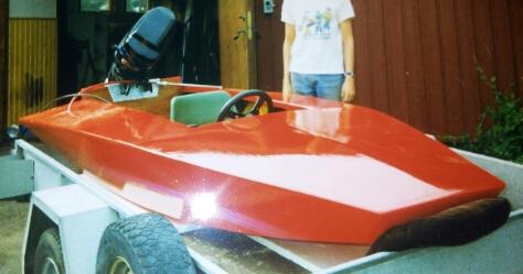 Tjusigt bygge. Hur gick det med allt? Här min fluga. Från 1975. Min son kör den och jag vattenskidor. Ca 10 år sedan. 28 hk Yamaha motor.  Trimplan (som justeras med vantskruvar)var nödvändigt för att få den att gå bra i vattnet. Hur gjorde ni?
