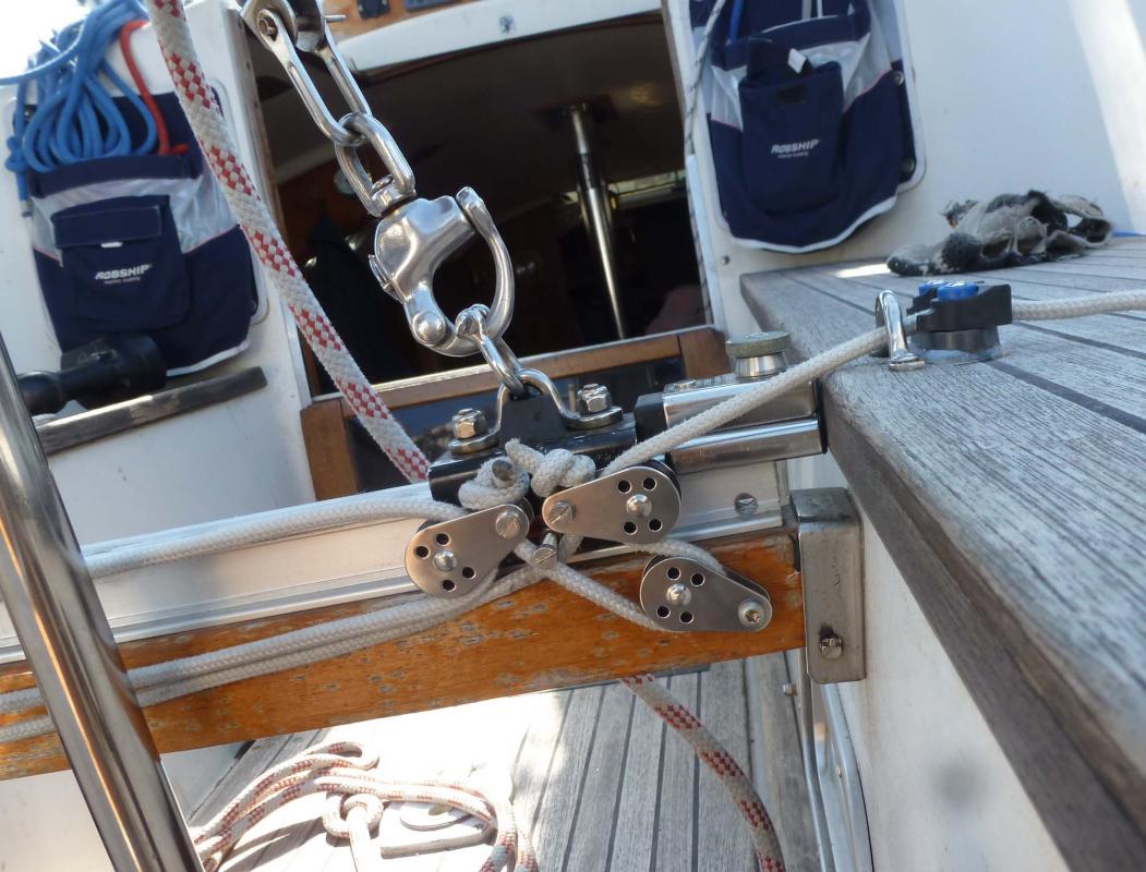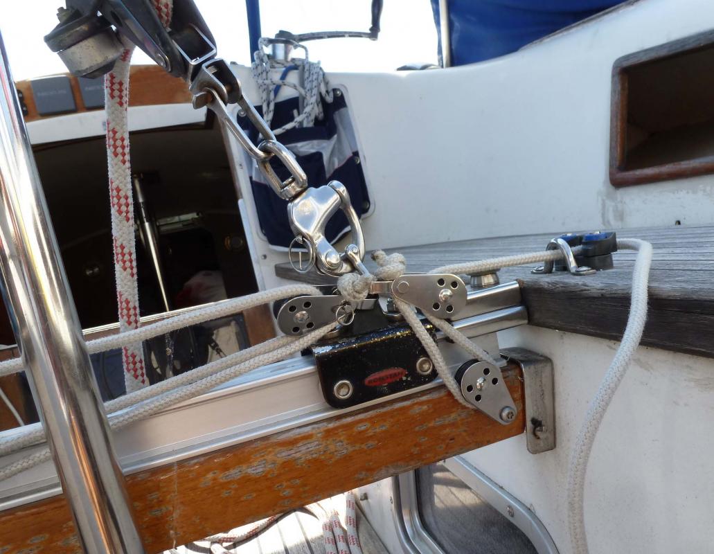 Larsakelarsson 32 Postad 2 Juni , 2016 (redigerade) Så här blev det och det funkar hyfsat bra. Skall flytta fästena för trimblock och skotlinan ner till vagnen så vinklarna blir bättre, hade inte rätt borr i verktygslådan. Har visserligen bara provat i c:a 7 m/s men det var inga problem att dra upp vagnen i lovart. Vanligtvis är det inte då utan i svagare vindar man behöver trimma vagnläget, så jag är nöjd med funktionen. Om man planerar ett slag går det så klart att släppa ner vagnen i lä (dvs nya lovart), låsa den där och sedan göra slaget, då är trimmet klart direkt efter slaget utan någon ansträngning. Kostnad: 4 trimblock Hjertmans 164 kr, 2 Skotlås Biltema 200 kr, byglar, skotlina o skruv hade jag i förråden, så det landade väl på c:a 400 kr totalt. Den ändlösa linan har en knop mitt på så man lätt kan ta loss linan från skotlåsen på tofterna om man vill ta bort hela skenan. Eftersom min ratt o piedestal ändå sitter där så brukar jag inte göra det så ofta... Redigerad 2 Juni , 2016 av Larsakelarsson Dela detta inlägg Länk till inlägg Dela på andra webbplatser