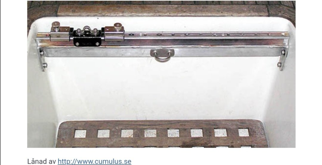 Hybro 1 292 Postad 21 Mars , 2022 (redigerade) Den som konstruerade just Cumulus, ansåg tydligen att det inte behövdes någon skotskena. Satt ursprungligen en enda ögla mitt i sittbrunnen. Förre ägaren monterade denna skena på en typ träregel, på samma ställe som skenan nu sitter på en balk av aluminium, bultad i sittbrunnen väggar. Detta av den anledning att träregel plötsligt gav med sig. Tjohopp... Och viss skulle skenan kunnat gå längre ut... Men då ovanpå typ britsararna. Blir då skavd där bak. Nu semesterseglar jag med det jag har, och det duger gott åt mig. Nån gång har jag slängt en tamp runt en winch och till motsvarande på andra, sidan och in till skotet, för att kunna skota typ längre ut. Är väl inte segelmässigt o stilfullt. Det funkar. När jag ska slå, så slackar jag först lite på storskotet och kan då flytta skotvagnen till andra sidan. Slår och justerar. Och öglan mitt på? Redigerad 21 Mars , 2022 av Hybro Dela detta inlägg Länk till inlägg Dela på andra webbplatser