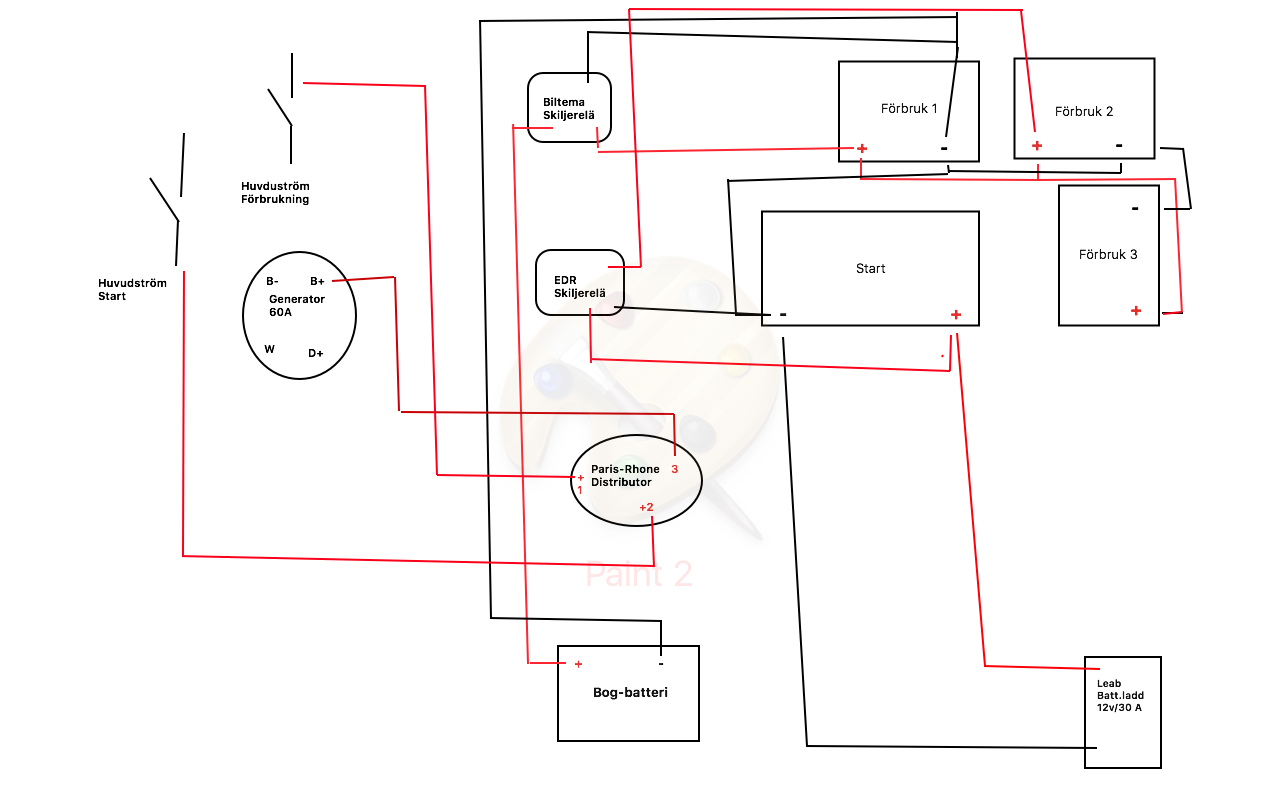Där går den svarta till startbatteriets minus. En röd kommer från startens plus och när det är 13.3 v eller mer på den så slår relät på och går till förbrukningens plus via den andra röda.