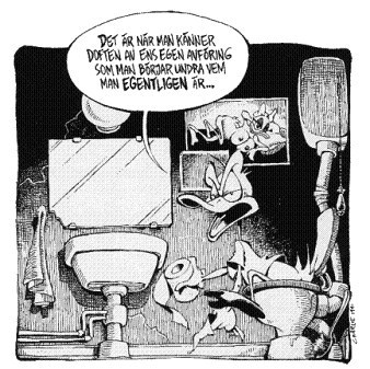 Georg_Ohm 5 093 Postad 2 November , 2017 (redigerade) Det är sällan man ser seriefigurena på toaletten. Frank Zappa, Kapten Stofil och Arne Anka är undantag, men Frank Zappa var ju ingen seriefigur i den bemärkelsen. De byxlösa Ankeborgarna kan ju lätt eliminera där de finner det lämpligt... (För övrigt är det underligt, ingen i Ankeborg tycks ingen ha egna barn, men väl brorsöner och systerdöttrar, hur nu det går till...) --- Man kan ju däremot undra om man kan göra någon yta i hamnen attraktiv för fåglar som vill tömma tarm och blåsa. Utan att skruva till det, vad är det som trigga änderna att bajsa? Det heter ju att "fåglar inte kackar i eget bo", varför det kan kännas märkligt att de förorenar sitt natthärbärge på badbryggan under den upphissade gummibåten? Kanske man kan ta hjälp av en ornitologisk beteendevetare? Tills dess föreslår jag följande: En lina med buntband på, som då har tampen kvar åt olika håll och som utgör en barriär med taggiga men någorlunda mjuka hinder för fåglarna. En stor färgglad leksaksorm på badbryggan, nån grön mamba eller liknande. En lina med upphängda (tomma) CD-ROM skivor som ger reflexer. Eller då det dyrare alternativet med en rovågelsdrake enligt ovanstående inlägg. Sedan är nog de elektroniska fågelskrämmorna mer roliga än effektiva... typ rörelsedetektor som utlöser någon form av ljud och eller blixtljus. Jag vet att det i alla fall funnits färdiga sådana lösningar med olika inspelade hundskall, kanske inte för utomhusbruk... har bara sett katalogbilder. Här hittade jag en bild på en badbrygga, före och efter rofågelsdrakens entré. --- Redigerad 2 November , 2017 av Georg_Ohm 1 Dela detta inlägg Länk till inlägg Dela på andra webbplatser