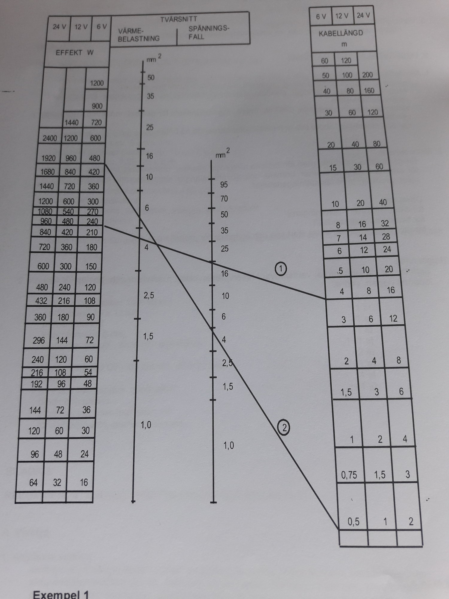 FinMick 87 Postad 27 April , 2018 Råkade snubbla över ett diagram för att bestämma rätt kabeldiameter. Frågan är ju uppe nu som då, men riktigt såhär enkelt har jag aldrig sett den besvaras! Man förbinder alltså effekten till vänster med längden på kabeln till höger med en linje och avläser i mitten vilken diameter som krävs med hänsyn till värmebelastning och spänningsfall, av vilka det högre värdet anger vilken diameter som bör användas. Dela detta inlägg Länk till inlägg Dela på andra webbplatser