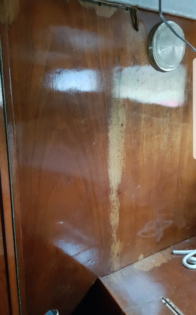 Just det, det är tveksamt, du skall nog ta ned hela skivan till trärent, eventuellt betsa och lägga på många lager lack. Personligen tycker jag att sammetsmatt lack är snygg, men det skall ju naturligtvis vara likadan yta som närliggande paneler i båten, annars ser det konstigt ut.