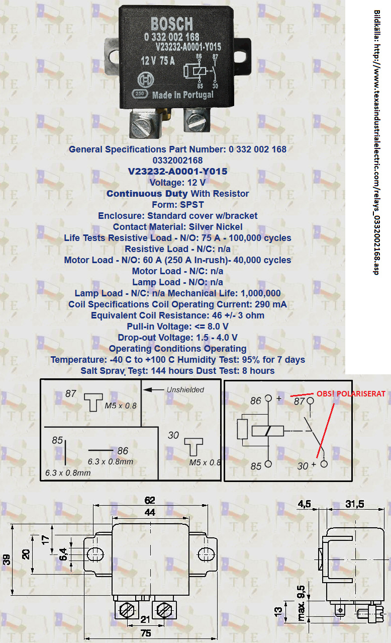 Thomas-1 311 Postad 5 Augusti , 2018 (redigerade) Hej! Ditt relä är nog okej för ändamålet. Men som du själv - och andra - säger måste ju de två oinkopplade reläkontakterna för styrning kopplas nånstans. (Men inte till batteriets plus&minus, vore meningslöst?) Eftersom du vill ha funktionen att bogpropellern skall vara garanterat inaktiv tills huvudmotorn startats så finns det bara en bra inkoppling kan jag tycka. Nämligen... Reläets kontakt 86 till generatorns D+ och reläts kontakt 85 till jord/battminus. D+ kan ha andra beteckningar på generatorn men där kopplas normalt skiljerelä för laddningen. Reläet drar endast då huvudmotorn startat och varvats upp tillräckligt så att generatorn har börjat ladda. Googlade f.ö. litet på ditt relä "0 332 002 168" och fann en segt uppkopplad texas-sajt enligt bilden nedan. (Se min snedställda källhänvisning, strunta däremot i att kolla den själv för det krävs tålamod.) Fann även en annan sajt med produktinfo om just ditt relä. Men i bilden nedan framgår också att reläet är "polariserat", det innebär att el-strömmen bör flyta i rätt riktning. Tänker alltså här närmast på högströms-kontakterna 30 & 87. [Det funkar bra även om du förväxlar dessa men inte så länge, slitaget av gnistor på reläets inre kontakter (här silver/nickel) är kort sagt anpassade för en viss strömriktning. Och gnistor blir det när sk induktiva lasters ström bryts, alltså saker med lindade spolar typ elmotorer. I ditt fall bör du därför säkerställa att 30 är kopplad till plussidan och 87 till bogmotorn och inte tvärtom.] Reläets styrspole har f.ö. en parallellkopplad resistor enligt schemat, gissar att det är nån sorts temp-beroende resistor typ NTC eller PTC? Vete katten, men eftersom reläet är avsett för kontinuelig drift så skyddar resistorn reläspolen mot överhettning?? Redigerad 5 Augusti , 2018 av Thomas-1 3 Dela detta inlägg Länk till inlägg Dela på andra webbplatser