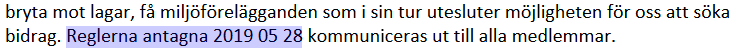 Peter_K 4 354 Postad 23 September , 2021 1 timme sedan skrev Mellgard: Miljöreglerna och miljöpolicyn har inte blivit stadgeenligt fastställda av årsmöte. De är utan laga kraft. Vilket jag upptäckte först efter att jag försökt få miljöpolicyn upphävd. Du blandar ihop stadgar och regler. Reglerna fastställs på årsmötena, men vad jag kan se behövs inget särskillt beslut kring detta. I och med att de anslagits/kommunicerats ut till medlemmarna och årsmötet hållits, har de ju fastställts. 1 Dela detta inlägg Länk till inlägg Dela på andra webbplatser