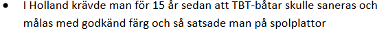 Mellgard 60 Postad 23 September , 2021 3 timmar sedan skrev No_jah: Man borde kanske komma på någon for av krympplast som kan användas till båtbotten istället för att täcka ovansidan av båten som är brukligt. Jag vet inte hur stor marknaden är, men det finns i alla fall en potentiell kund. "Your tax money at work"https://www.transportstyrelsen.se/globalassets/global/sjofart/dokument/fritidsbatar1/skrovmalet/protokoll20160831.pdf TBT-spårning med hjälp av hundar? TBT var i båtbottenfärger bundet som polymeren tributyltennmetakrylat. Polymerer varken luktar eller avdunstar. Eventuell lukt kommer från tillsatser. Dela detta inlägg Länk till inlägg Dela på andra webbplatser