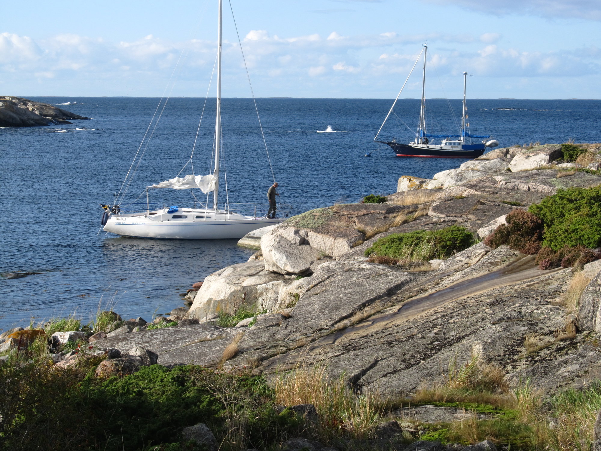 Mellgard 60 Postad 29 September , 2021 Sådana här turer på hösten brukar det bli. (utdrag från facebook). Då vi gick från Huvudskär till Svenska Högarna 2019-09-07 hade vi undanvind, endast ett litet försegel hissat, öppen rufflucka och inga livlinor. Så det var väl då precis som för Erik Aanderaa i hans video från utanför Haugesund på norska västkusten. 😉 Fast vi såg ju en annan segelbåt (bild), en enda, och det gjorde nog inte han. Det visade sig senare att vi haft en mer äventyrlig natt vid Högarna än önskat. För på kryssarklubbens hemsida kunde vi efteråt läsa att "Kättingen på bojen vid Svenska Högarna är angripen och är i dåligt skick. Detta skall åtgärdas så snart som möjligt". Att byta bojkätting där kan nog vara besvärligt. När vi senast (2015-09-19) var vid Högarna kunde vi ta landförtöjning (bild), och en annan båt låg vid bojen. I den gamla boken "Seglarhamnar på ostkusten" står att läsa "Svenska Högarnas utsatta läge längst ut i havsbandet, avskilt från de andra utskärgårdarna, gör att följande icke nog kan understrykas: Till Svenska Högarna skall endast den segla som har en fullt sjövärdig båt, och en besättning som kan ta den därifrån även när vädret har gjort läget på de nedan beskrivna ankarplatserna oroande eller ohållbart". Fast moderna navigatorer gör stor skillnad, sådana där man på en kartskärm kan se både sin exakta position och kurs. Då vi senast (2019-09-10) gick in i östra hamnen på Arholma, efter nattsegling från Åland, kunde vi gå in helt "blint" i mörkret utan att se omgivningarna. Dela detta inlägg Länk till inlägg Dela på andra webbplatser