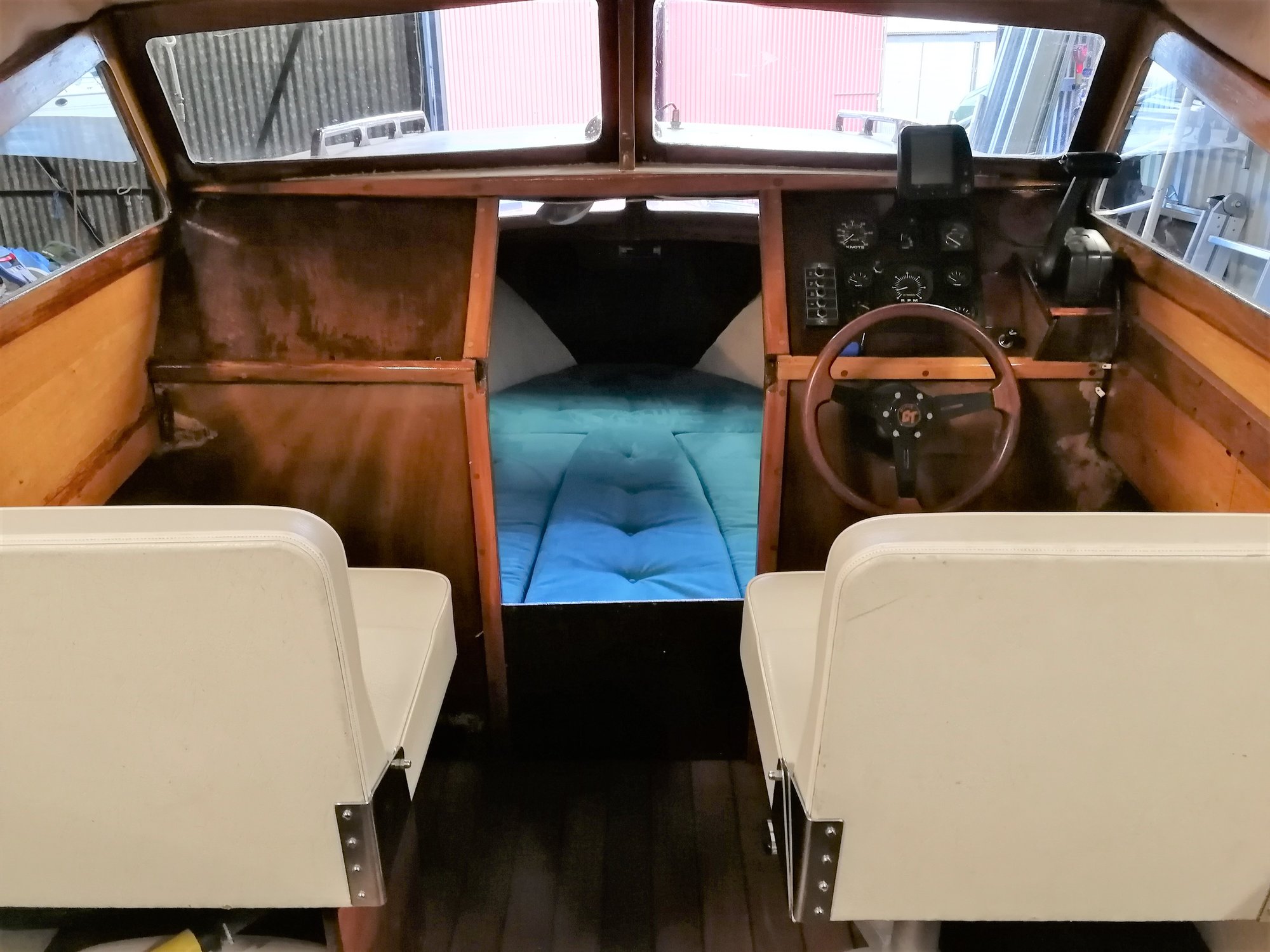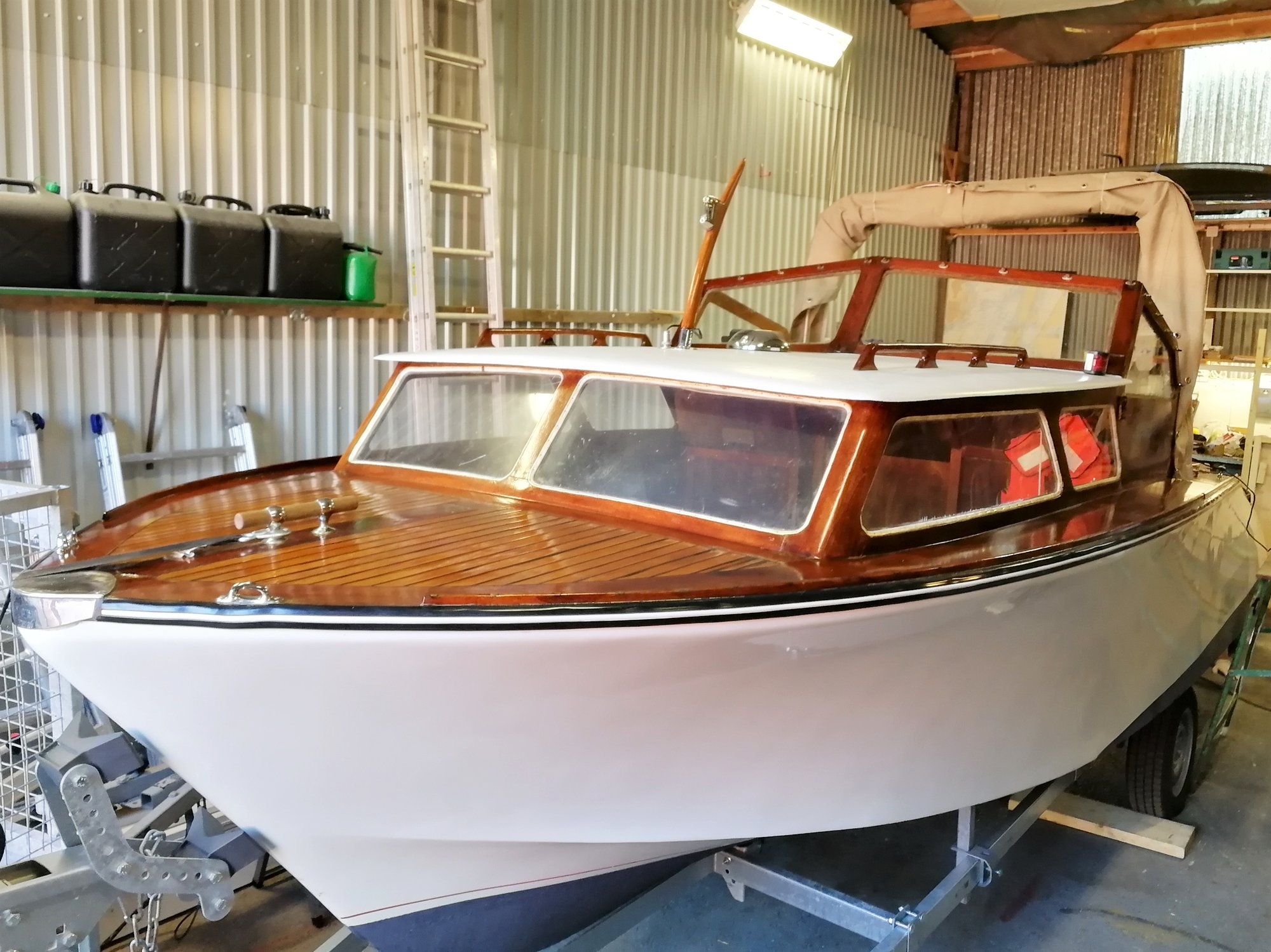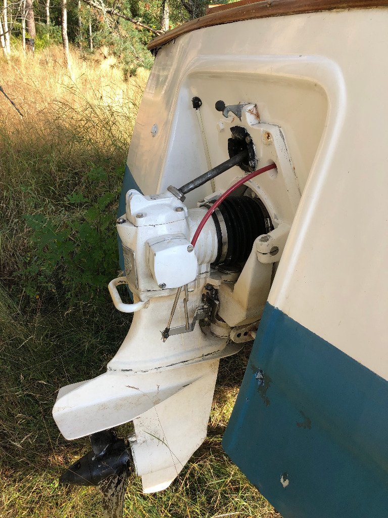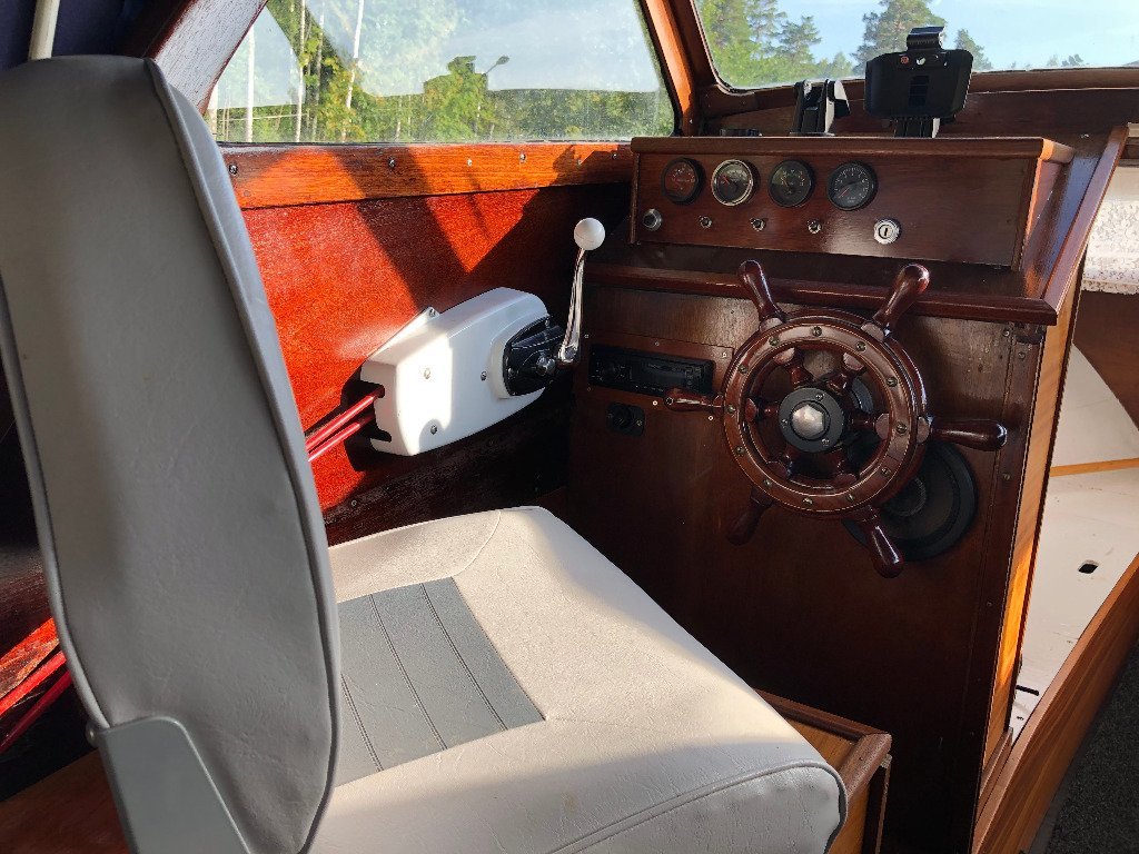 Det ser som en kabinbåt från 60-talet med glasfiberskrov och trädäck och överbyggnad i mahogny. En gammal klassisk B20 med 100-drev hade den också. Det jag föll för var de fina linjerna och den sluttande stilen på aktern som annars bara hittas på gamla italienska mahognybåtar liknande riva.
